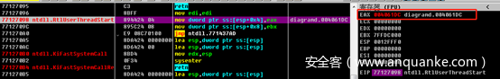子进程启动时由于被挂起,所以在线程恢复时执行RtlUserThreadStart,EAX的值指向线程执行的起始位置开始执行注入的DLL的OEP: