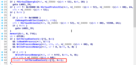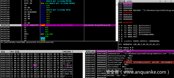 将之前在内存中释放的DLL写入到子进程中,并调用SetThreadContext设置子进程的EIP,从而执行注入的代码: