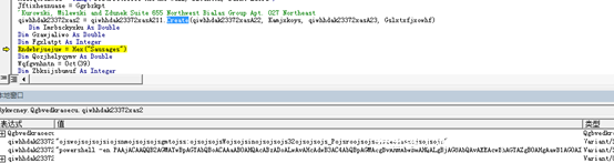 当用户启用宏之后则会自动执行AutoOpen,从而触发宏代码。AutoOpen中最终会解码出一段Base64编码的PowerShell代码,随后调用PowerShelll执行该段Base64代码。