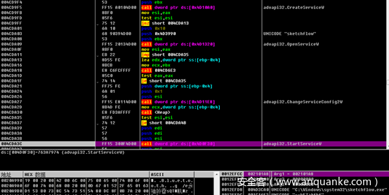 创建名称为”sketchflow”的服务,并启动服务sketchflow.exe,该EXE为自身拷贝到system32目录下,随后该进程调用ExitProcess退出。