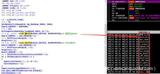 模块启动之后会获取计算机名称以及当前进程名称,并在内存中解密出账号和密码的字典。