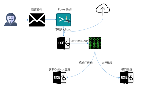 本次捕获的样本从服务器下载的PayLoad中实则还包含两个攻击模块。一个模块为窃取OutLook数据,另一个模块为横向渗透。