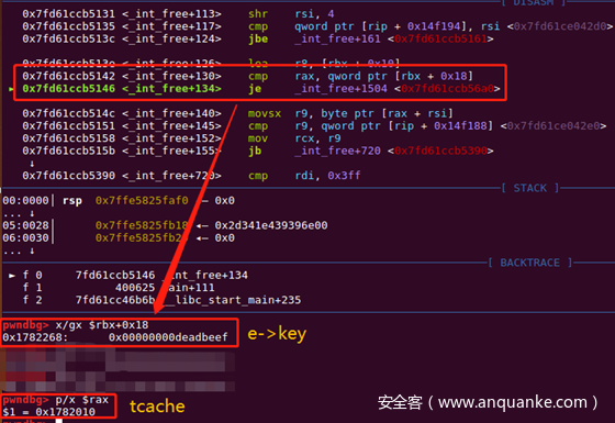 如果将其e->key修改后,通过调试可以发现能绕过e->key==tcahce的检查,从而实现double free。