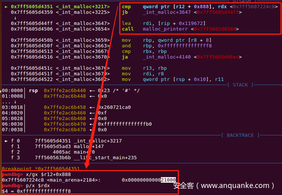 其中第三项检查内容对unsortedbin attack来说阻碍很大,因为unsortedbin attack目的是往目标地址中写入main_arena地址,需要修改victim->bk也即bck。如果还想这么利用,就需要在目标地址上写上victim的地址(通常是heap地址,因此需要提前知道heap地址),而且还有一点是不能修改victim->fd的值,除非在篡改victim->bk的时候不覆盖掉victim->fd或者已知libc地址。也就是说,在大多数情况下,除非你已知heap和libc的地址,否则很难在利用unsortedbin attack了。
