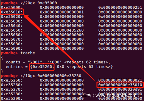 在将chunk放入tcache之后,会将chunk->key设置为tcachestruct,即是heap的开头,来表示该chunk已经放入了tcache。而将chunk从tcache取出来后则将chunk->key设置为NULL清空。 总体上对tcache的改动是在tcacheentry结构指针中增加了一个变量key,来表明该chunk是否处于tcache的状态。