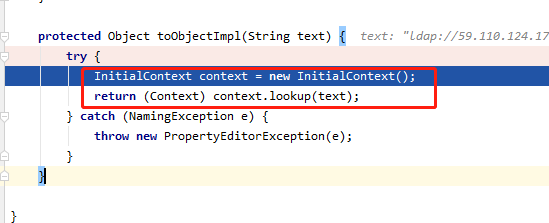 此时出现经典的JNDI注入,text 刚好就是我们传进的asText,我们可控,从而达到命令执行目的