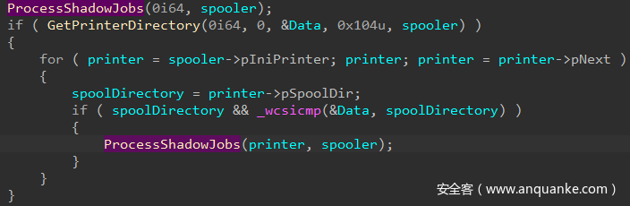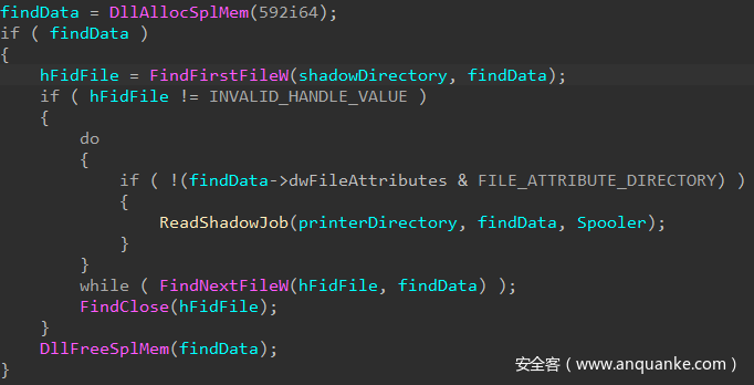 该过程会处理与Spooler自身有关的影子作业文件(服务端作业),然后枚举每个INIPRINTER,获取其spooler目录(通常是默认值),然后处理其对应的影子作业文件数据。