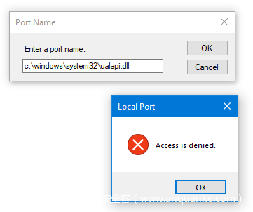 现在我们可以试着不去管C:\Windows\Tracing\,而是选择C:\Windows\System32\Ualapi.dll作为打印端口(之所以选择该路径,大家可以参考我们之前的一篇研究文章)。