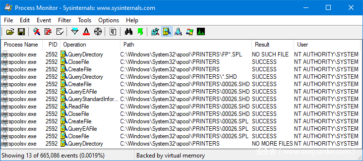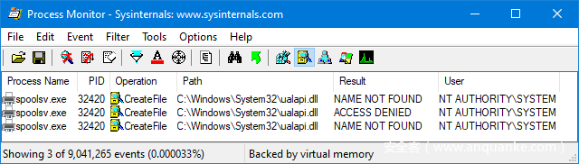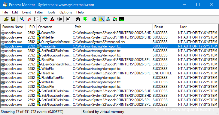 如果大家翻一翻上文,观察Add-PrinterPort后Spoolsv.exe对注册表的操作,我们可以看到一个熟悉的XcvData调用栈,其中会直接跳到XcvAddPort/DoAddPort,并不涉及到DoPortIsValid。一开始我们认为访问注册表的操作会在访问文件后完成(我们在Process Monitor中屏蔽了该类型),并且认为端口验证已经完成。然而,当我们启用监控系统事件功能后,却没有发现CreateFile。