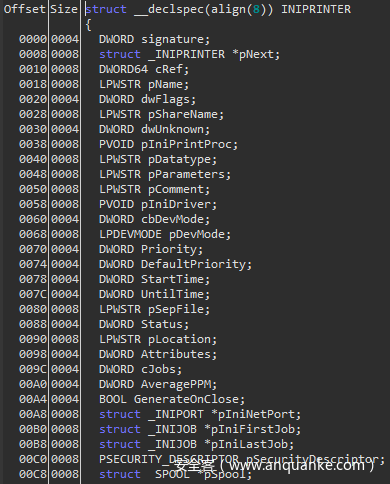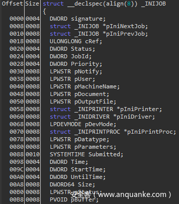 由于Spooler采用C++编写(具有丰富的类型信息),我们发现Spooler会采用INIJOB数据结构来跟踪打印作业。
