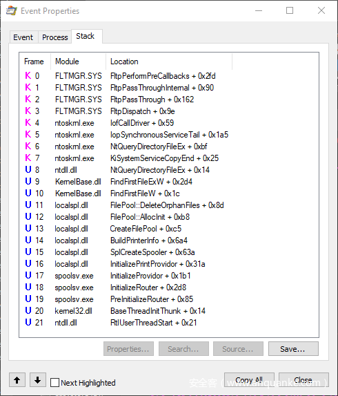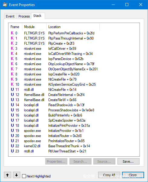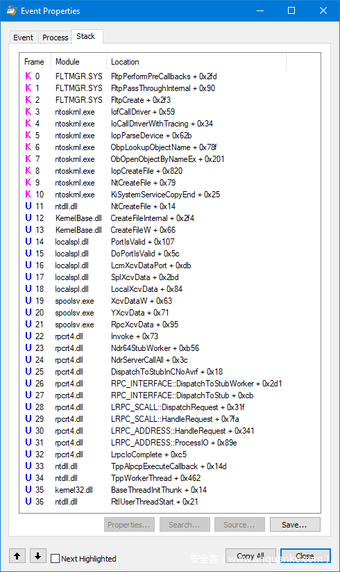 使用PortIsValid命令时对XcvData的调用栈如下图所示。根据“Event”标签页提供的信息,Spooler现在正在模拟用户,而用户并不具备c:\Windows\System32的写入权限。