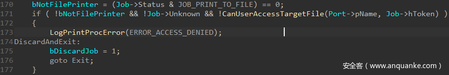 当打上补丁后,微软现在将PortIsValid检查逻辑移到了LcmXcvDataPort中,这种利用方式将不再起作用。即便如此,如果攻击者已经创建了恶意端口,那么用户仍然可以执行这种“打印”操作。这是因为CanUserAccessTargetFile的检查逻辑并不适用于“指向文件的端口”,只适用于“打印到文件”的场景。