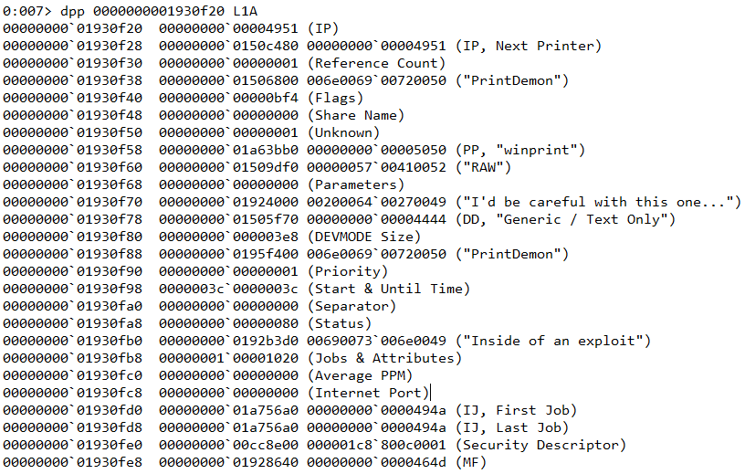而如果使用我们PoC中printserver创建的打印机,在内存中我们可以看到如下布局: