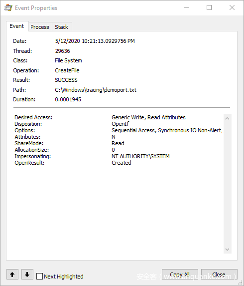 由于Process Monitor可以显示模拟令牌,因此我们选择双击CreateFile事件查看。前面我们也执行过这个操作,当时PortThread正在模拟某个用户,但现在呢?如下图所示: