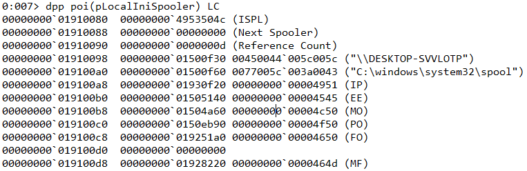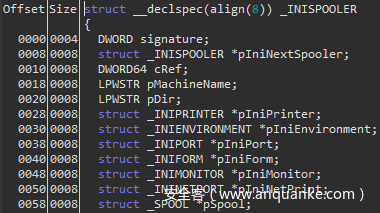 首先我们需要在Localspl.dll中找到pLocalIniSpooler指针,其中包含指向INISPOOLER的一个指针,部分字段如下: