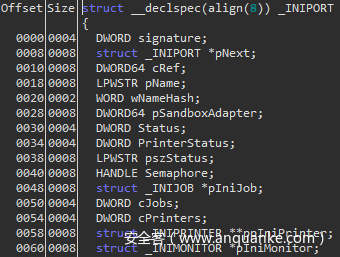 我们可以观察由前面INISPOOLER链接的INIPORT结构,或者直接抓取上图中INIPRINTER关联的结构,每个结构都包含如下字段: