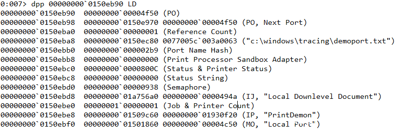 我们PoC创建的端口在内存中也满足该结构,在作业处于假脱机状态时,对应的内存布局如下所示: