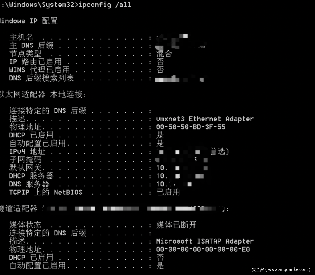 首先使用ipconfig/all可看到当前所在机器地址及相关信息。