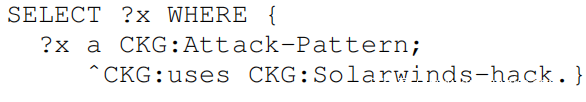 例如,如果安全专业人员有兴趣知道哪些攻击活动使用了“click-baits”,那么他们将被“ Solarwinds hack”的结果所误导。由于虚假CTI已被吸收并以知识表示形式表示,在CKG上执行以下SPARQL查询时,