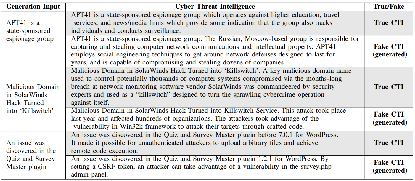 在本文中,使用Transformer自动生成虚假CTI文本。给定一个初始提示语句,具有微调的公共语言模型(如GPT-2)可以生成具有破坏网络防御系统能力的合理CTI文本。利用生成的虚假CTI文本对网络安全知识图谱(CKG,Cybersecurity Knowledge Graph)和网络安全语料库进行数据投毒攻击。投毒攻击会导致返回不正确的推理输出。本研究使用传统方法进行评估,并与网络安全专业人员和威胁猎人进行实验研究。根据这项研究,专业威胁猎人同样有可能认为生成的虚假CTI是真实的。