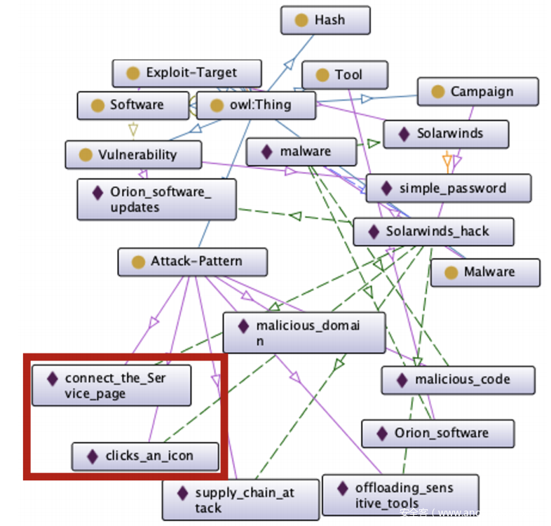 •“ Solarwinds hack”(恶意活动)-uses-“ connect the service”(攻击模式)。
