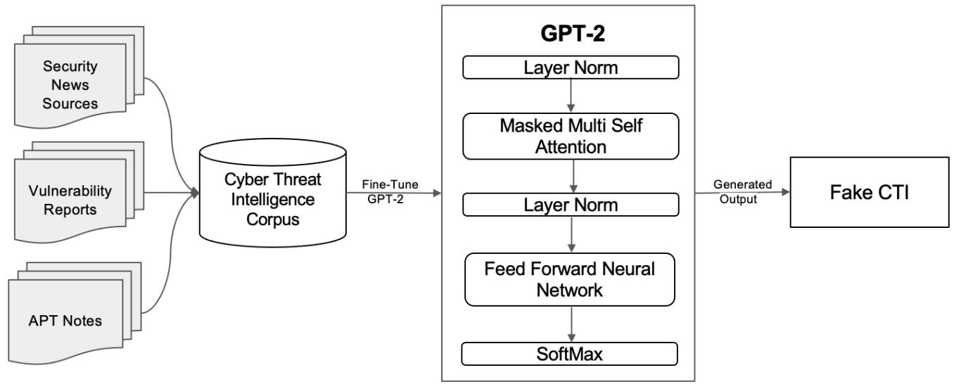 在本节中描述了虚假CTI生成流程。下图展示了整体方法。首先创建一个网络安全语料库。网络安全语料库包含来自各种OSINT来源的CTI的集合。然后,在网络安全语料库上对预训练的GPT-2模型进行微调。经过微调的模型能够自动生成大量的伪造CTI样本。最后评估模型并描述针对CTI的投毒攻击。
