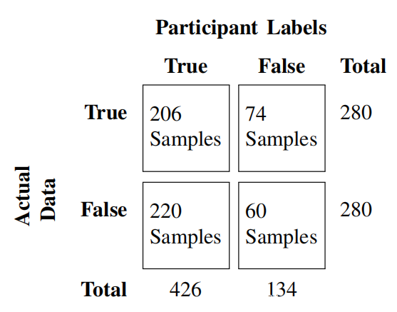 为了评估在现实环境中生成的虚假CTI的潜在影响,对由十名网络安全专业人员和威胁猎人组成的小组进行了研究。为参与者提供了一组真实和虚假的CTI文本样本的评估集。参与者使用自己的专业知识,将语料库中的每个文本样本标记为真或假。通过收集来自各种来源的真实CTI的112个文本样本来创建评估集。通过将文本样本截断为前500个单词并消除部分最后的句子来对文本样本进行预处理。选择每个样本的第一句话作为微调GPT-2模型的初始提示,并生成一个不超过500个单词的伪造CTI示例。进一步将112个样本(56个真实的CTI及其生成的假样本)分为两个单独的注释集,以确保真实的CTI和直接假冒副本不属于同一注释任务的一部分。因此,每个注释任务包括28个真实文本样本和28个不重叠的生成假数据样本。将分配给参与者的每个注释任务中的数据随机化。