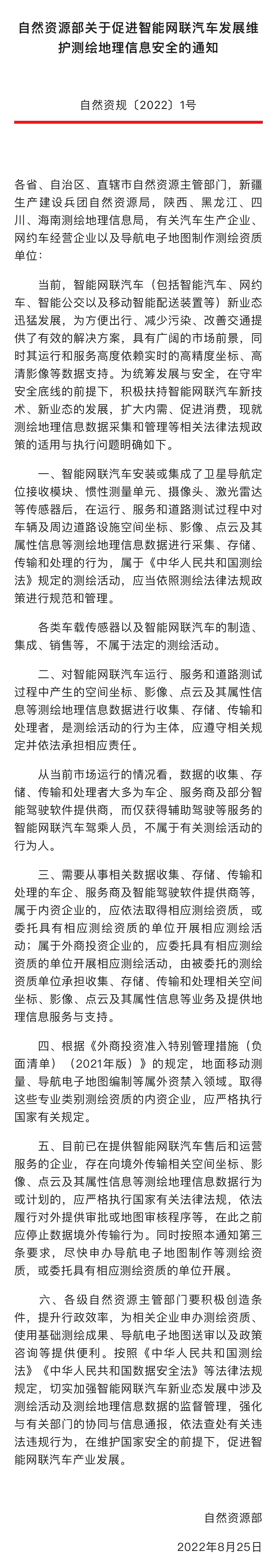 本报北京8月30日电 (记者杜鑫)记者今天从自然资源部获悉,该部印发的《关于促进智能网联汽车发展维护测绘地理信息安全的通知》(以下简称《通知》)提出,对智能网联汽车运行、服务和道路测试过程中产生的空间坐标、影像、点云及其属性信息等测绘地理信息数据进行收集、存储、传输和处理者,是测绘活动的行为主体,应遵守相关规定并依法承担相应责任。《通知》明确,需要从事相关数据收集、存储、传输和处理的车企、服务商及智能驾驶软件提供商等,属于内资企业的,应依法取得相应测绘资质,或委托具有相应测绘资质的单位开展相应测绘活动;属于外商投资企业的,应委托具有相应测绘资质的单位开展相应测绘活动,由被委托的测绘资质单位承担收集、存储、传输和处理相关空间坐标、影像、点云及其属性信息等业务及提供地理信息服务与支持。《通知》要求,目前已在提供智能网联汽车售后和运营服务的企业,存在向境外传输相关空间坐标、影像、点云及其属性信息等测绘地理信息数据行为或计划的,应严格执行国家有关法律法规,依法履行对外提供审批或地图审核程序等,在此之前应停止数据境外传输行为。同时,按照《通知》要求,尽快申办导航电子地图制作等测绘资质,或委托具有相应测绘资质的单位开展。[阅读原文]