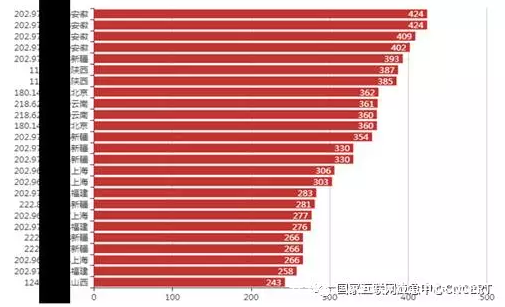 根据CNCERT监测数据,包含本地伪造流量的DDoS攻击事件占事件总量的51.3%,通过本地伪造流量发起攻击的流量来源于725个路由器。根据参与攻击事件的数量统计,归属于安徽省电信的路由器参与的攻击事件数量最多,最多参与了424件,其次是归属于陕西省电信的路由器,如图21所示。