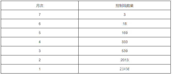 控制端尝试发起攻击的月次情况如表1所示。平均每个控制端在今年的1.19个月发起了DDoS攻击,有3个控制端地址在至少连续7个月次持续发起攻击。