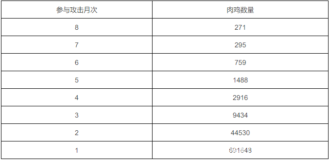 肉鸡资源参与攻击的月次总体情况如表2所示。平均每个肉鸡资源在今年的1.11个月被利用发起了DDoS攻击,有271个肉鸡地址在连续8个月次被利用发起攻击,也就是说,这些肉鸡资源在监测月份中每个月都被利用以发起DDoS攻击,没有得到有效的清理处置。