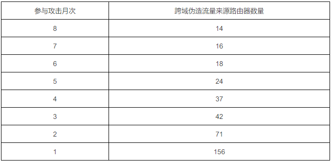 表4跨域伪造流量来源路由器参与攻击月次情况