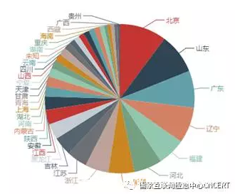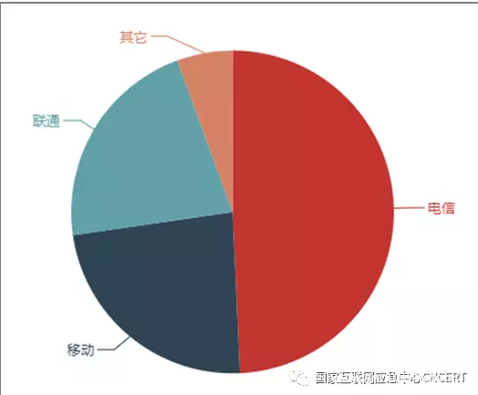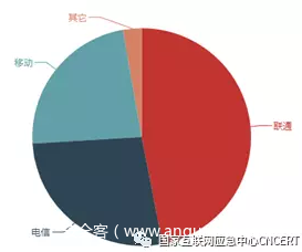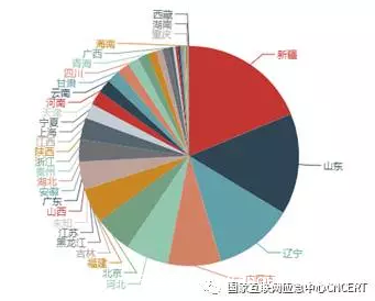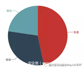 根据反射服务器数量按省份统计,新疆占的比例最大,占18.7%;其次是山东省、辽宁省和内蒙古,如图12所示。按运营商统计,联通占的比例最大,占47%,电信占比27%,移动占比23.2%,如图13所示。