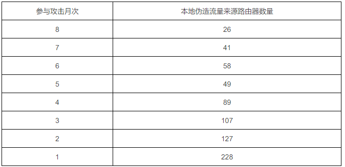 表5本地伪造流量来源路由器参与攻击月次情况