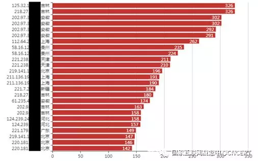 根据CNCERT监测数据,包含跨域伪造流量的DDoS攻击事件占事件总量的49.8%,通过跨域伪造流量发起攻击的流量来源于379个路由器。根据参与攻击事件的数量统计,归属于吉林省联通的路由器参与的攻击事件数量最多,均参与了326件,其次是归属于安徽省电信的路由器,如图17所示。