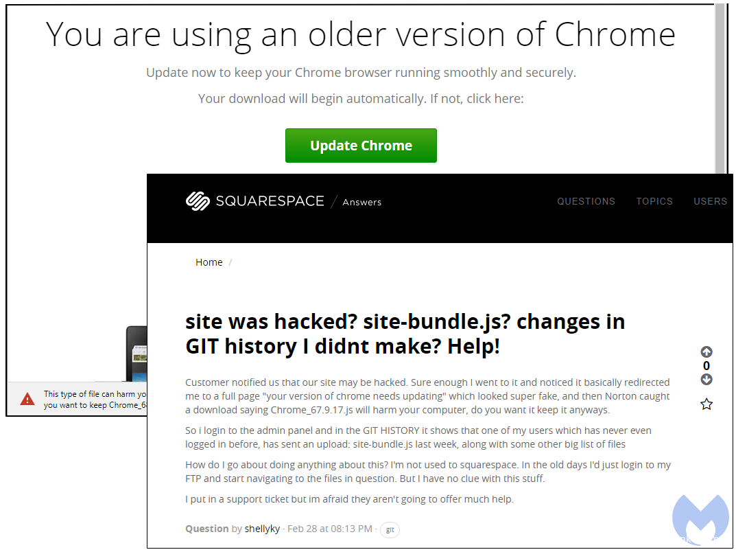 Squarespace是另一款十分受欢迎的CMS,但也同样受到了这场恶意活动的影响。这是由 @Ring0x0指出的。我们在2月28日发现了一篇论坛帖子,一位squarespace的使用者寻求帮助,他说“我会经常被重定向到另一个页面,显示“您的Chrome版本需要更新””。