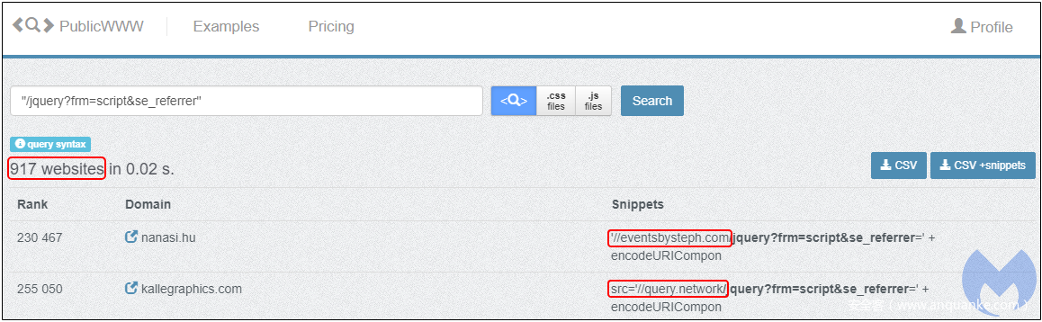 根据PublicWWW query查询结果显示有超过900个SquareSpace网站已经被注入了这个恶意重定向代码。