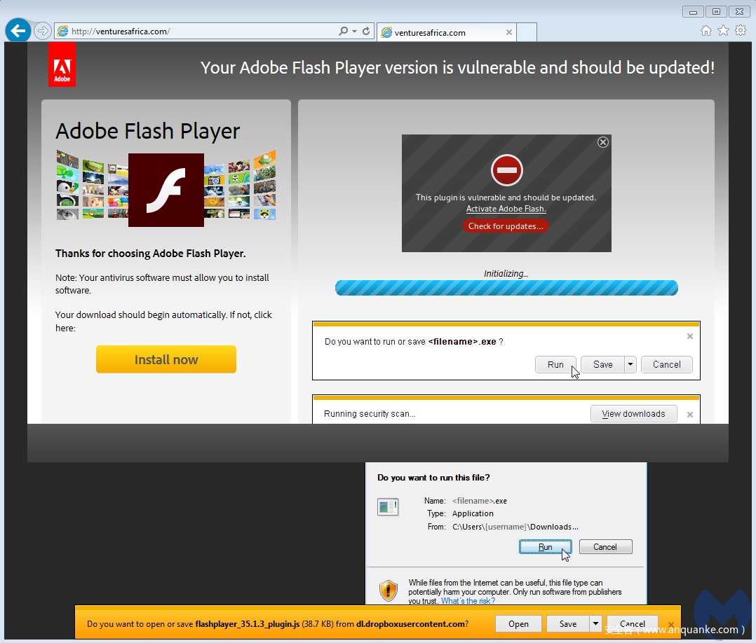 攻击者使用的有Chrome, Firefox和Internet Explorer浏览器的模板,后者会被替代成Flash Player更新界面。
