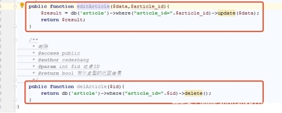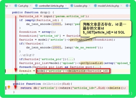 applicationadmincontrollerArticle.php 删除文章功能的Drop方法调用了delArticle 且参数可控,$_GET[artcile_id]==input(‘param.article_id’)