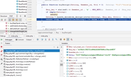 公共模块logicBuy.php buyDecrypt 方法中存在可以被用户控制的反序列化操作,利用thinkphp5的代码执行反序列化pop chain 可以往目标服务器写文件getshell.