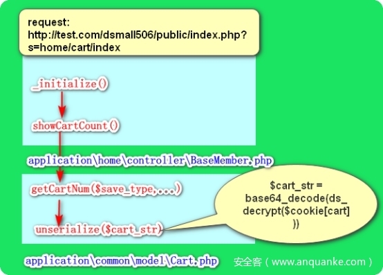 这里对getCartNum这个点的利用进行分析一下。通过查找存在多处对getCartNum的函数的调用,跟踪分析controller子类BaseHome中有一条简单方便的call chain,这条调用链的起点来自BaseHome类的初始化函数中,因此该类的所有子孙类的任何方法调用都会触发这条调用链。整个调用过程: