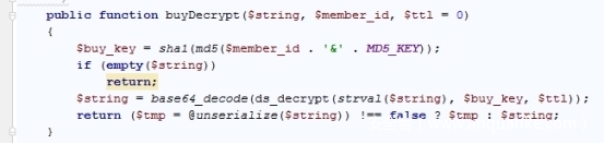 Unserizlize(base64_decode(ds_decrypt(strval($string),sha1(md5($member_id . ‘&’ . MD5_KEY)), 0)))