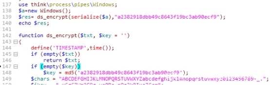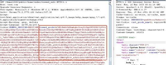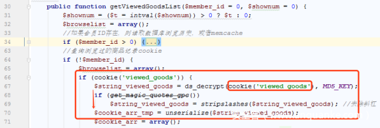 公共modelGoodsbrowse getViewedGoodsList 查看用户浏览过的商品信息,当用户处于登录状态时候直接从缓存中获取商品信息进行反序列化操作,如果尚未登录则从cookie里面获取并解密然后进行反序列化,由于cookie加解密函数的KEY是一个固定的值,写死在代码中,因此反序列化函数unserialize的参数可以被我们控制,利用thinkphp5的代码执行反序列化pop chain 可以往目标服务器写文件getshell.