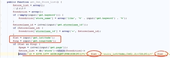 变量 $lat和$lng使用input 函数来获取,其实就是 $_GET或$_POST的值,这个函数是thinkphp封装的获取请求值函数。获取之后直接拼接传入where(),where()函数是thinkphp封装的函数,官方推荐使用 where(array[])来对用户数据进行处理比较安全,如果直接作为字符串参数传入该函数,那么对参数就需要用户自己进行过滤或转移处理,否则直接带入数据库进行查询,这是thinkphp官方文档的开发说明,而这里并没有按照官方文档说明来做,也没有进行转移或过滤,故造成SQL注入。