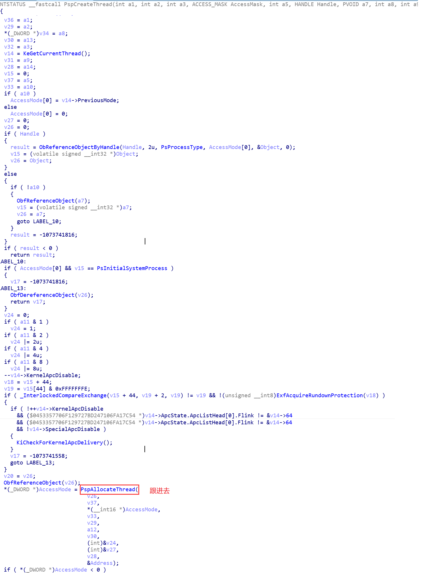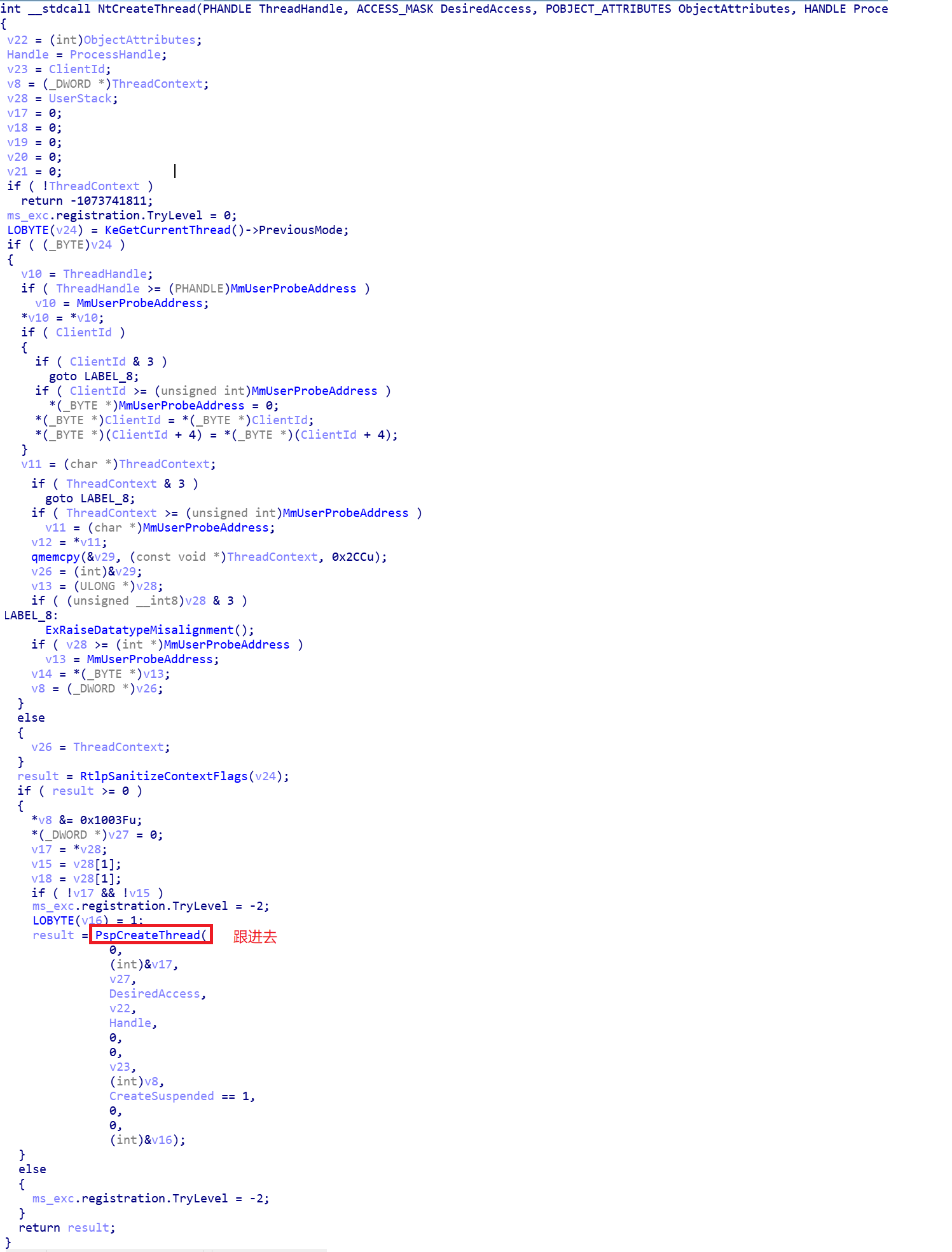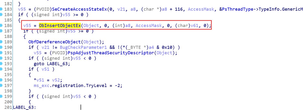 绕了这么一大圈,就为了看他一眼,好了回归正题,那又是在哪里插入进去的呢?NtCreateThread中还有一个关键的函数调用,即PspInsertThread(),该函数内部调用了另一个关键的API即ObInsertObjectEx(),如下所示: