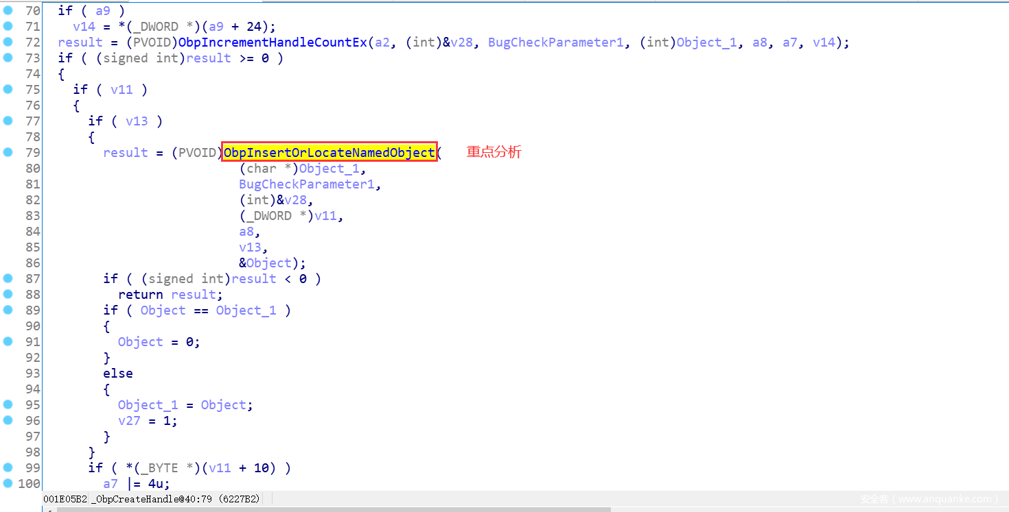 ObpCreateHandle()中调用ObpInsertOrLocateNamedObject()进行对象的插入或者名字的定位,这个函数非常关键,其内部有算法,跟进去。